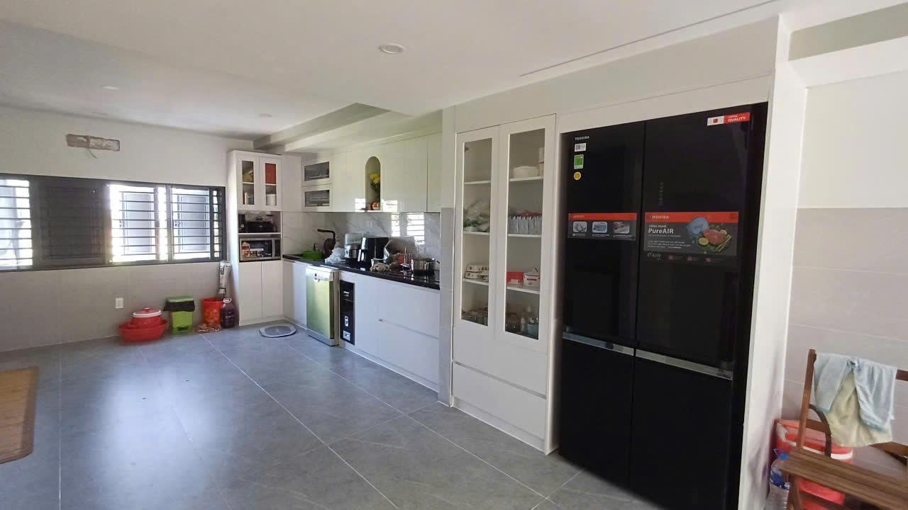 Tầng trệt gồm phòng khách rộng rãi, khu bếp – ăn bố trí liền kề, tạo sự kết nối liền mạch trong sinh hoạt gia đình. Không gian được mở ra sân trước và sân sau, giúp tăng cường thông gió và ánh sáng tự nhiên.